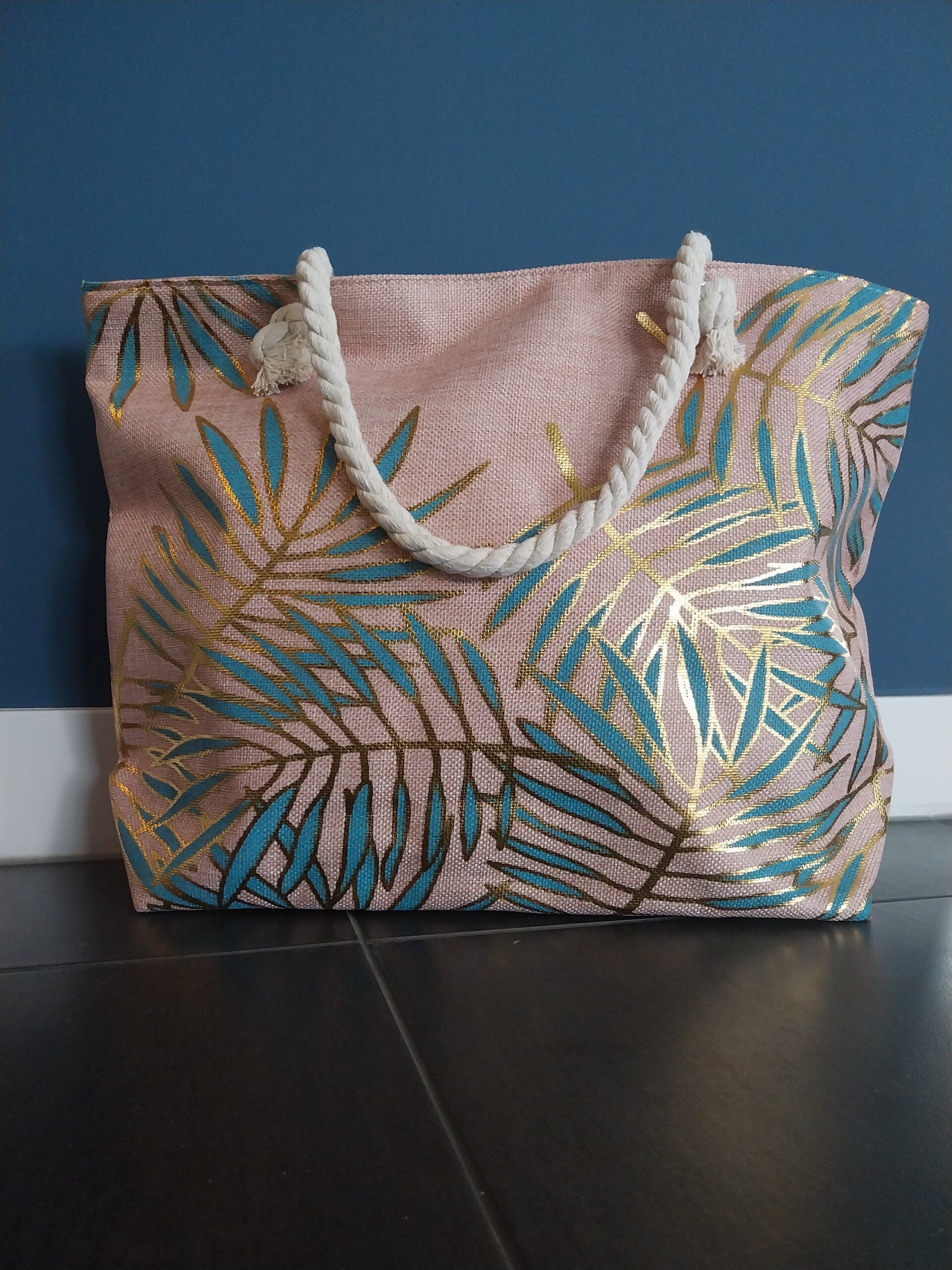 Strandtas roze met blauw blad